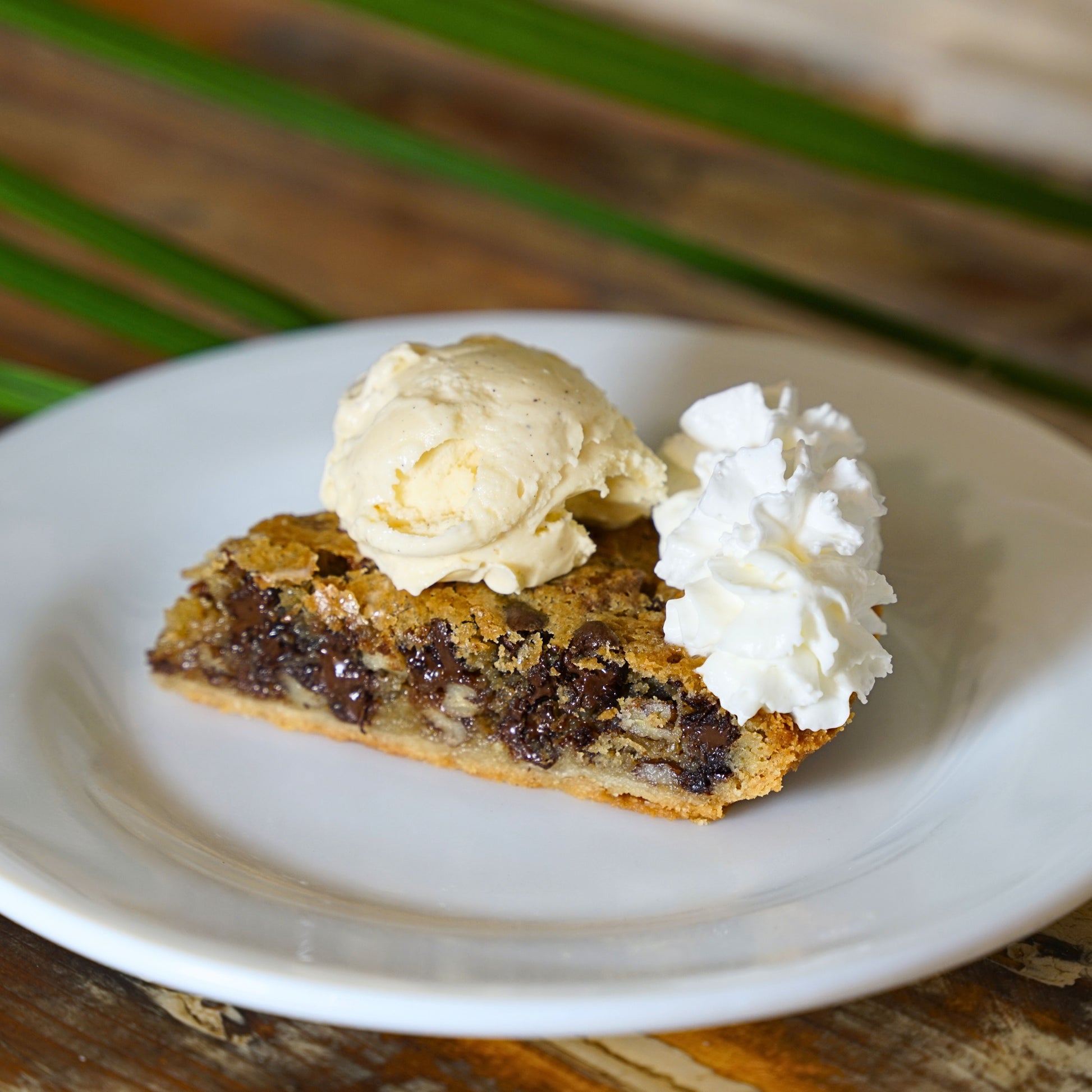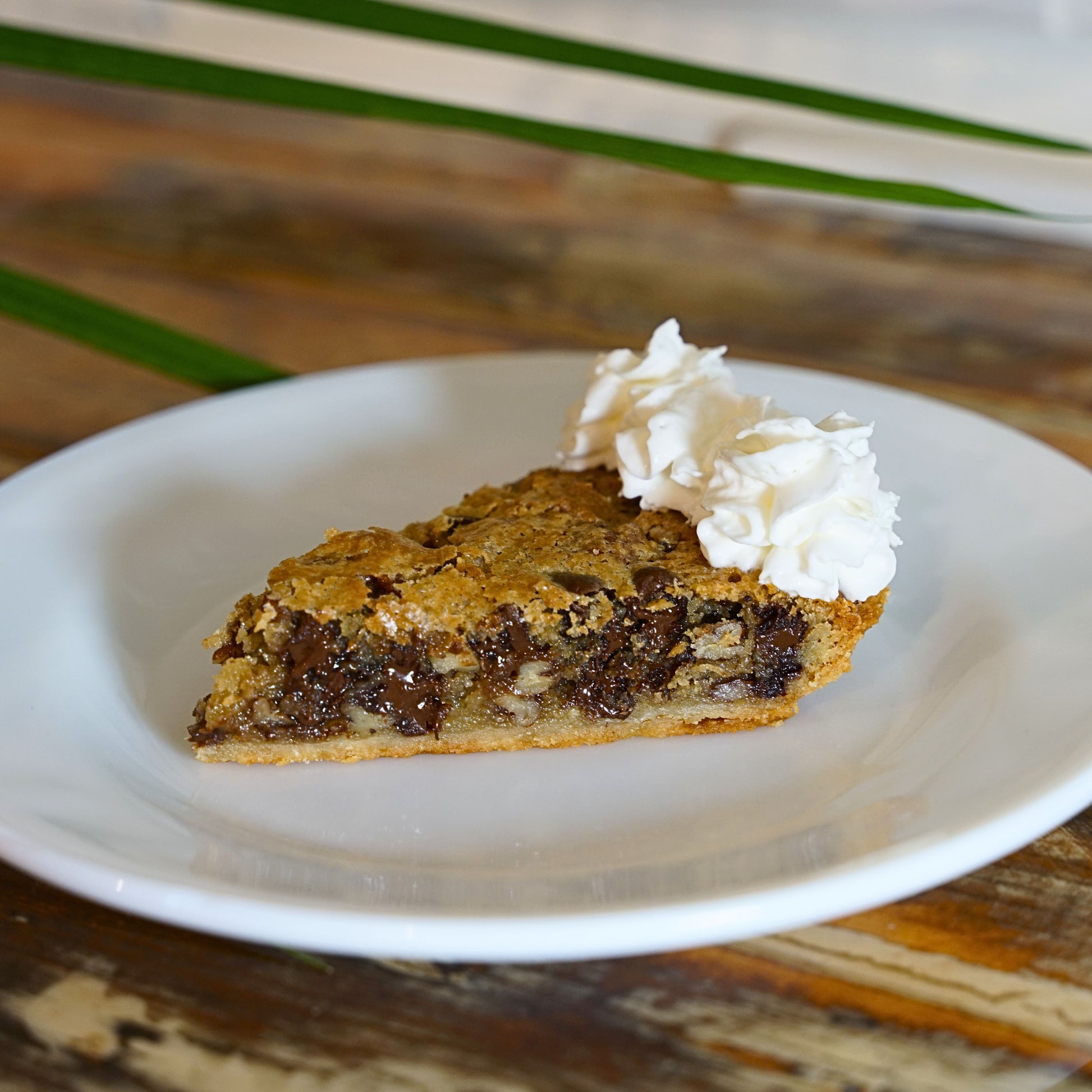 This signature chocolate chip cookie pie is baked to golden perfection with rich chocolate chips and crunchy pecans, creating the ultimate melt-in-your-mouth experience.